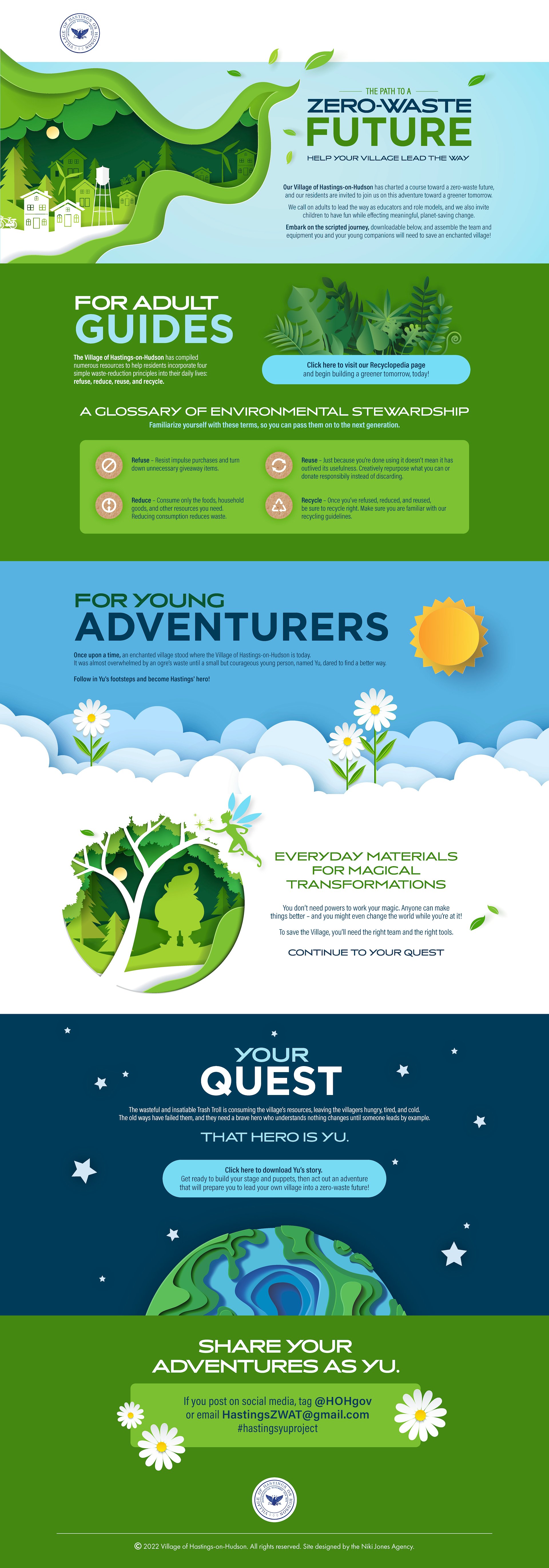 The initiative kicked off at the Village’s paperless spring festival. Reusable pop-up banners with QR codes linked to the campaign landing page where a play teaching waste-reduction principles to families could be downloaded. The download included instructions for creating the play’s characters, setting, stage, and props all out of repurposed items.